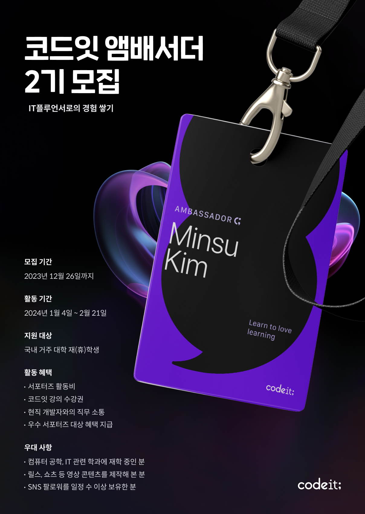 코드잇 앰배서더는 온라인 코딩 교육 구독 서비스 코드잇에서 코드잇에 관련한 온라인 홍보 콘텐츠 제작 및 매주 나오는 미션을